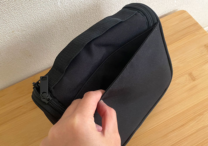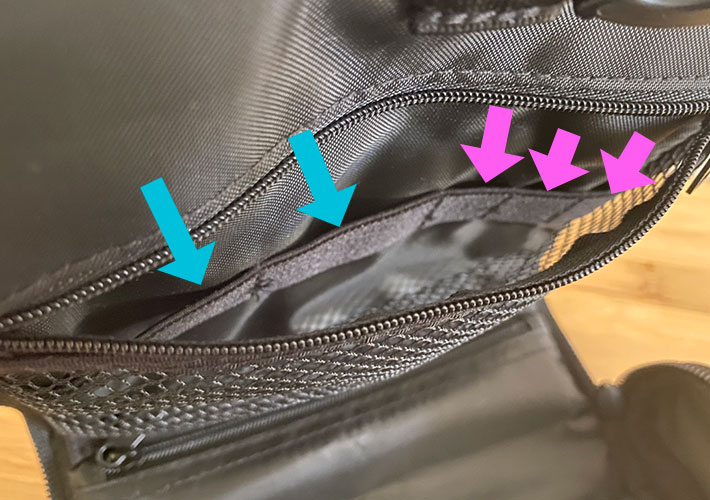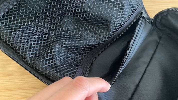 メッシュポケットのすぐ下にもファスナー式の収納スペースがあり、抜かりがありません。