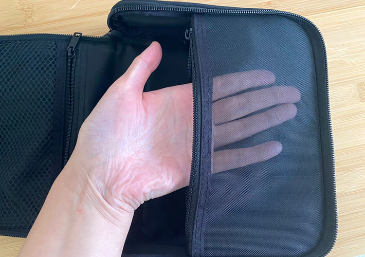 メインコンパートメントの手前には、中が透けて見えるメッシュポケットが。