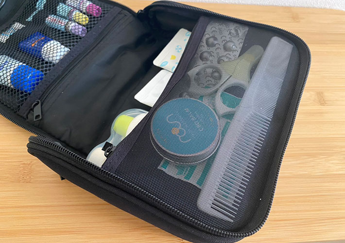 マチがないので、コームやボディバーム、コンタクトの洗浄用錠剤、子供用の爪切りハサミなど、厚みのないアイテムを入れています。