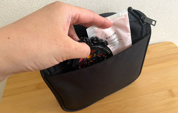 すぐにさっと取り出せるスリットタイプなので、ミラーやコーム、メイク落としシートなどを入れておくといいですよ。