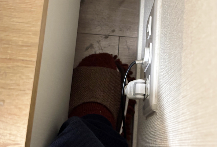 テレビ台裏の狭いスペースでも、『モップスリッパ』を履いた片足を簡単に潜り込ませることができました!