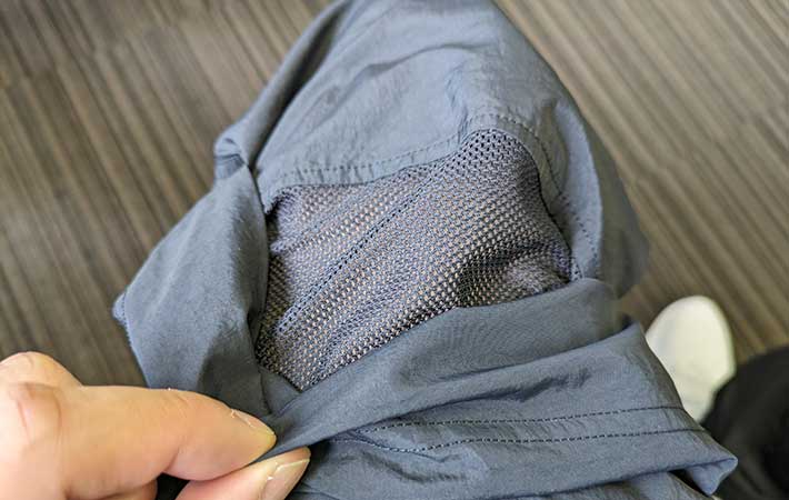 また、ヒザのあたりの生地をめくると、中がメッシュになっていることが分かります。通気性はかなりよいといえるでしょう。