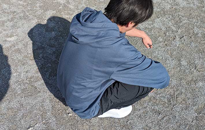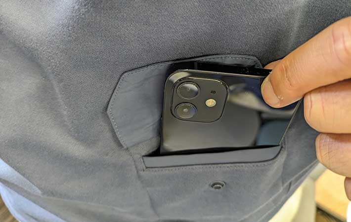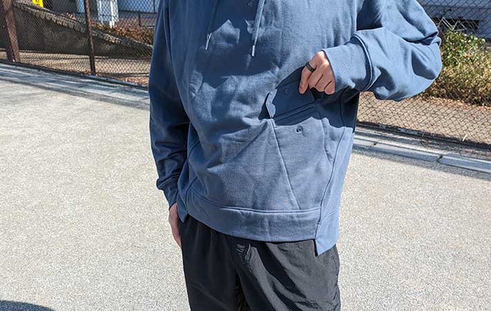 ちなみに、着用しているパーカーには、スマホなどがピッタリと入るポケットが付いています。