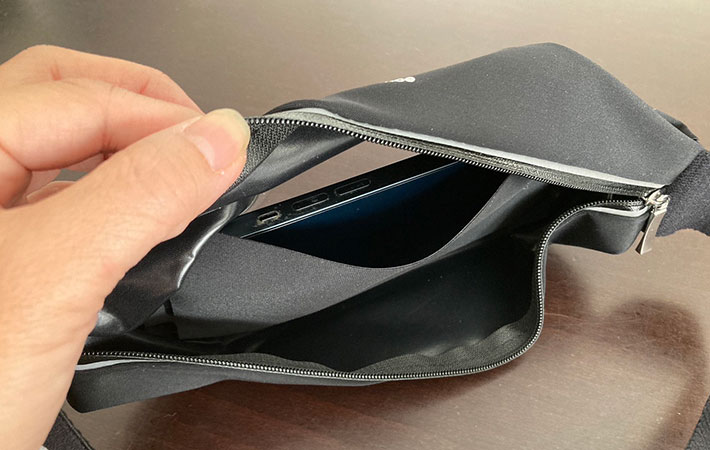 スマホを入れるスペースも小さく、生地に伸縮性もないため、筆者のiphon13もケースに入れたままだと入りません。