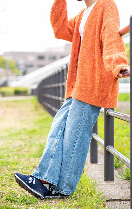 定番カラーといわれているネイビーや色鮮やかなオレンジを履いている人の足元を見てみると、このような履きこなしをしていました。