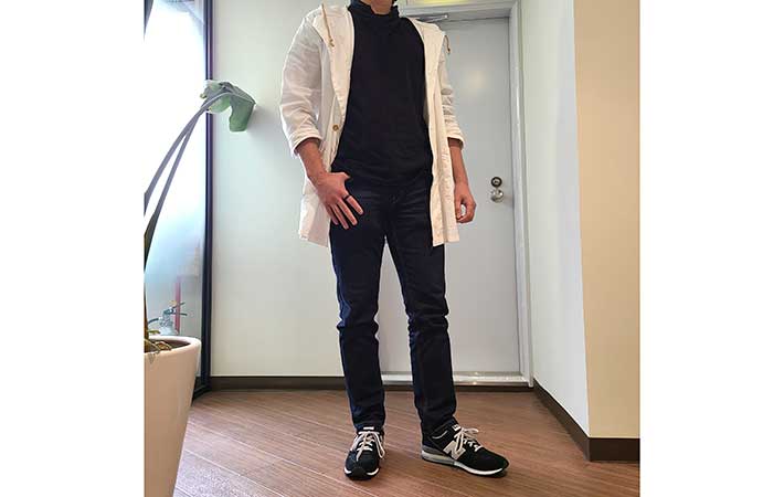 写真中央は、ジャケット×デニムの王道の組み合わせとニューバランスで、『休日のお出かけ』を意識したコーデです。