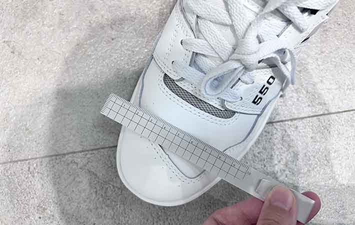 こちらの写真では、定規を当てる場所を間違えていますが…『550』のつま先がシュッと細い作りになっていることが分かります。
