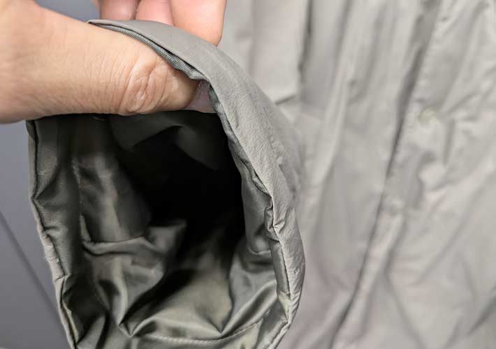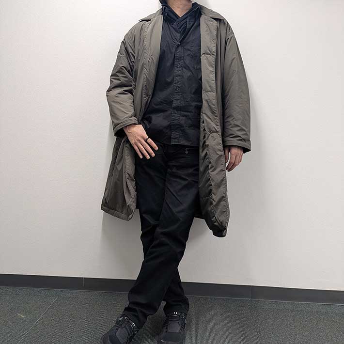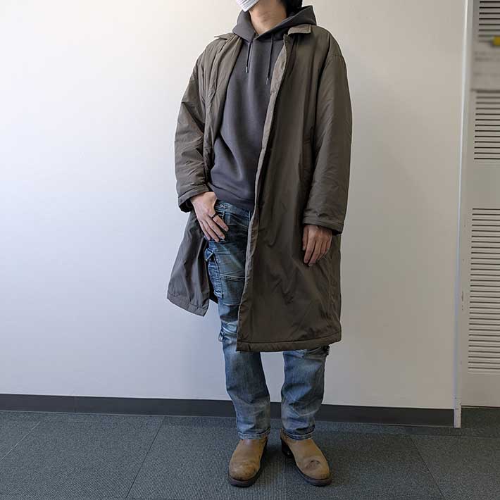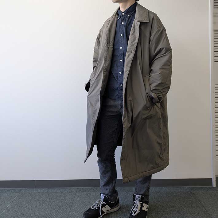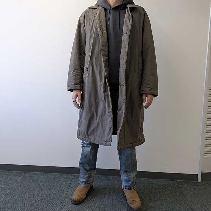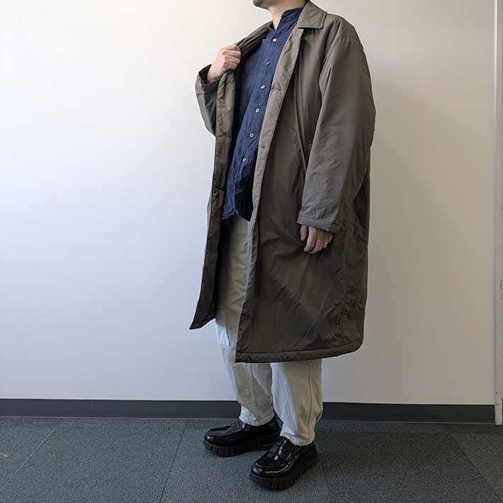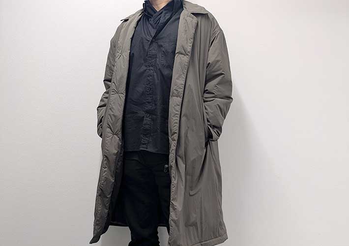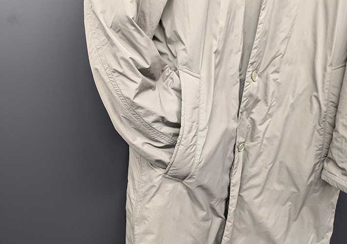 一部植物由来の中綿が入っていますが、全体的に薄く、ロングコートとは思えない軽さが印象的です。