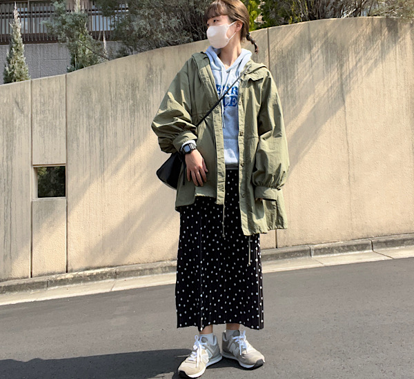 Iラインを意識したので、上半身と足元にボリュームを出してバランスよく。 タイトスカートの丈感と、ニューバランスの丸っこいぽてっと感で足首がきれいに見えますよ。