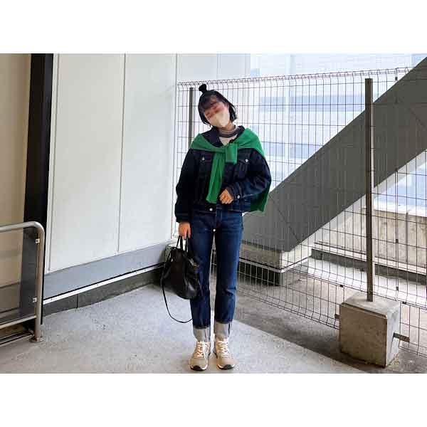 濃い色のデニムオンデニムコーデ。