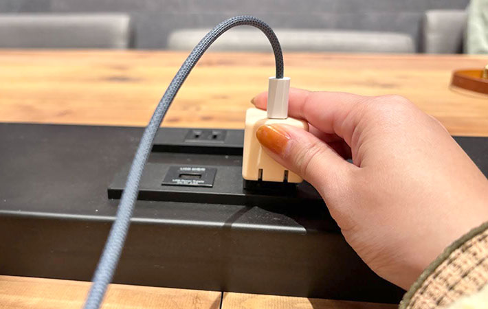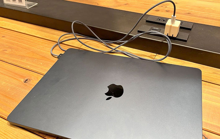 カフェのコンセントに挿しても邪魔にならず、スマートに充電できますよ。