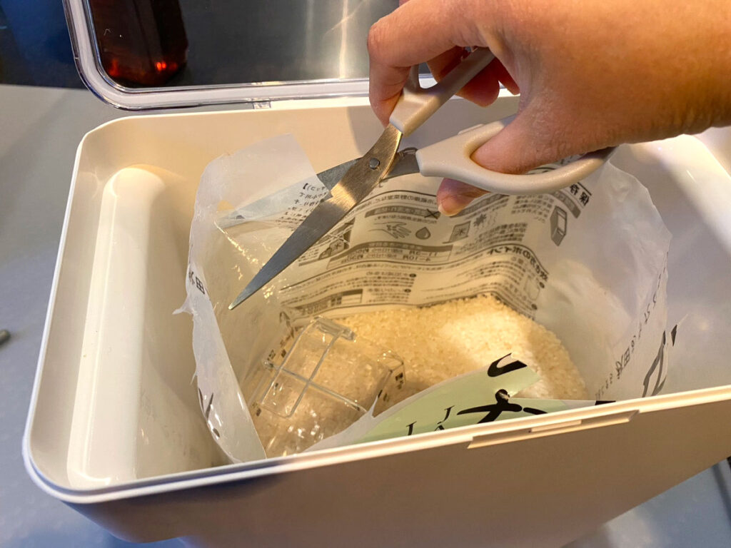 以前は袋からざざーっと米びつに入れ替える際に、うっかり米が飛び散ってしまうこともあったのですが、これは袋ごと入れられるのでストレスフリーなんです。