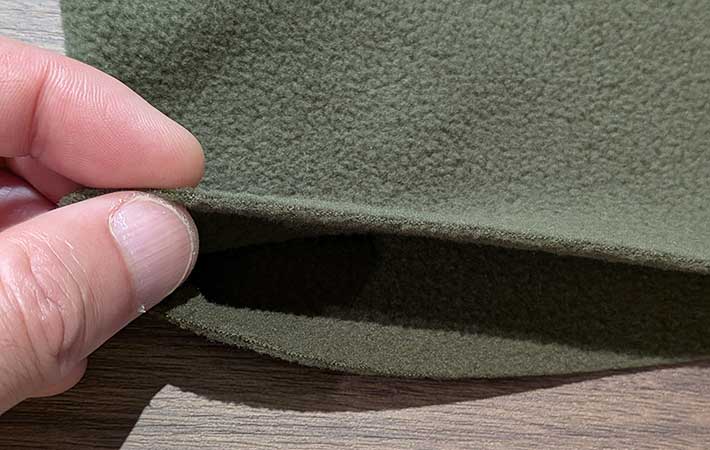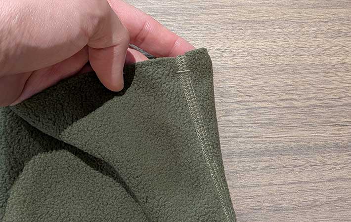 2枚の布を両端で縫い合わせているネックウォーマーをよく見かけますが、ライトネックウォーマーは1枚のフリースを1か所で縫い合わせています。