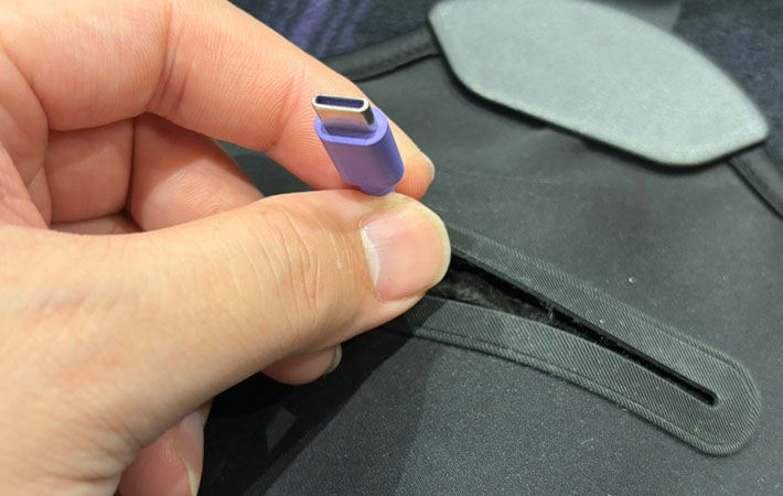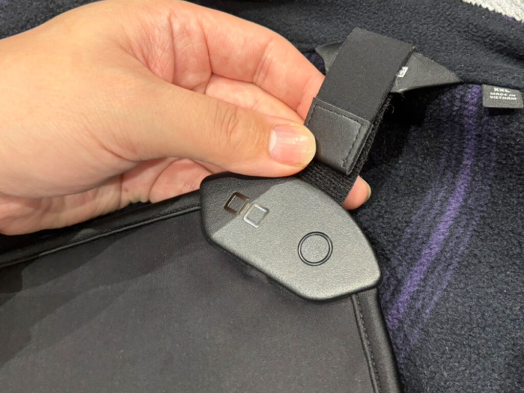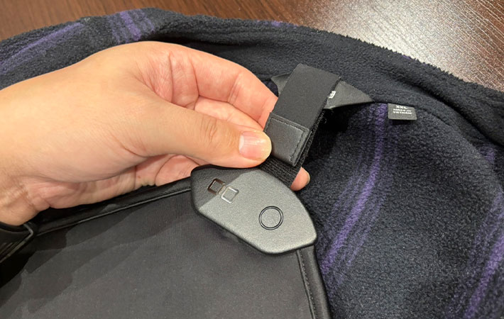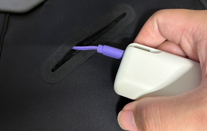 『CIO WEARHACK 2』を上着に固定したら、裏面のポケットに小型のモバイルバッテリーを入れ、ポケット内にあるUSB-Cケーブルを接続。