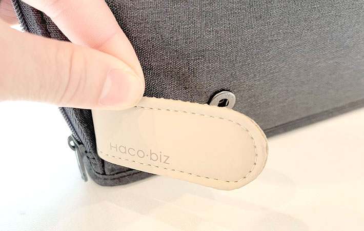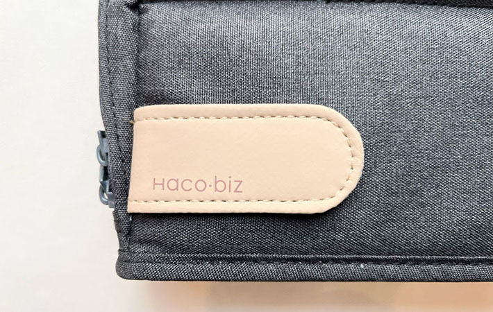 前面の左下には、『Haco・biz』と刻印されたスナップボタン式のベルトがついています。