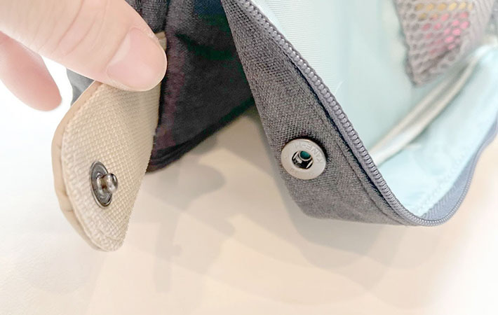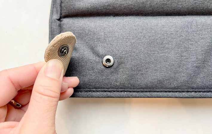 ファスナーを開けた後、サイドに備わっているスナップボタンにベルトを留めます。