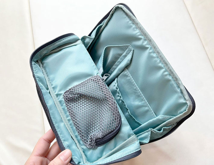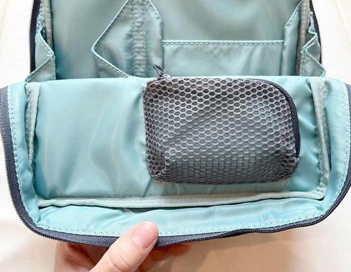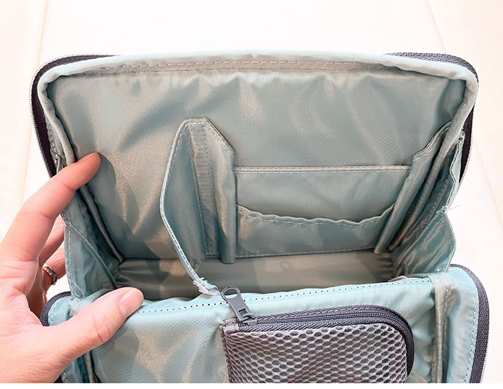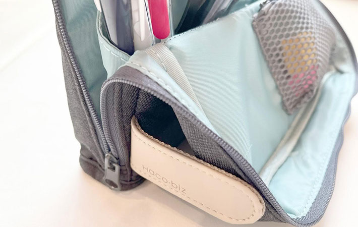 落ち着いた色合いの外側とは対照的に、内側の生地は明るい水色。中身が見えやすくなっています。