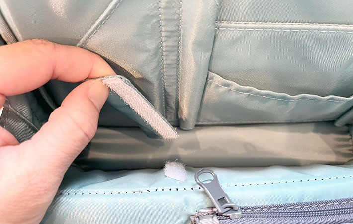 後方にある仕切りは面ファスナー式なので、用途に合わせて取り外しできるのもポイント。