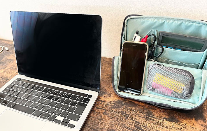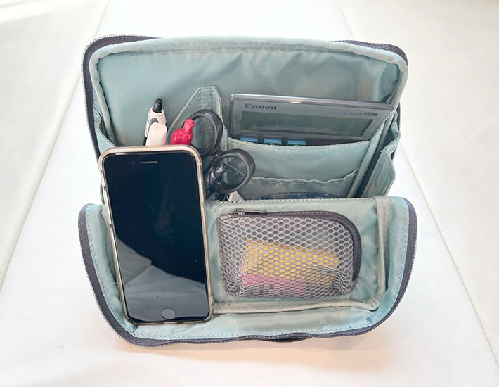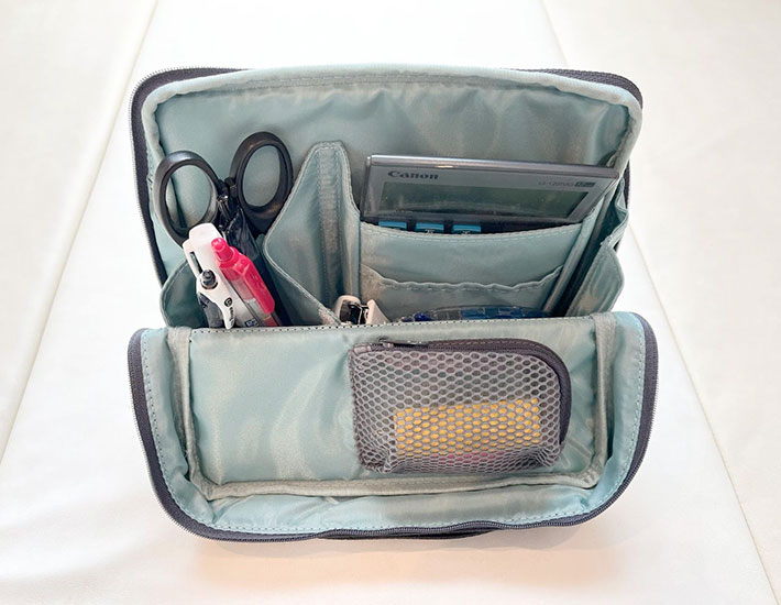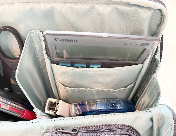 後方右側の1番後ろのポケットは、電卓を入れるのにジャストなサイズ感。ほかのアイテムは余ったスペースに収納しています。
