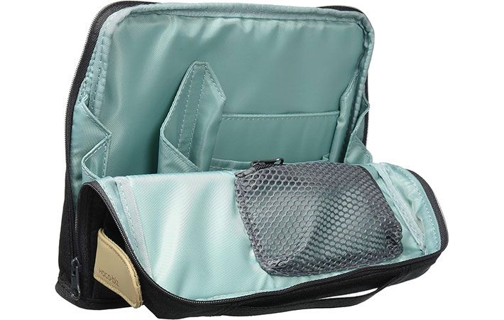 後方には仕切りが1つと、サイズの異なるポケットが2つ備わっています。