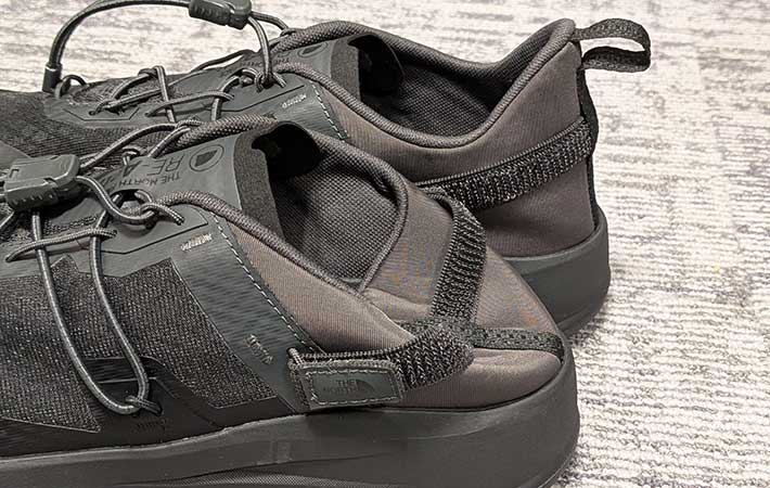 変わった機能では、カカトについているストラップを外して巻きつけることで、靴をつぶして持ち歩くことができます。
