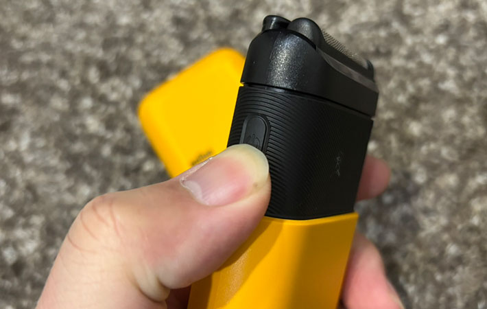 小型の電動ヒゲ剃りでここまで明るい色味は少し珍しく、ちょっとテンションが上がる見た目です。