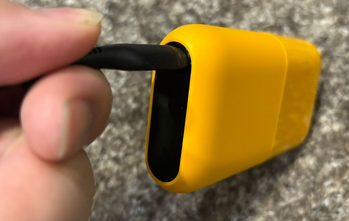 事前に1時間ほど充電しておけば、外出先でも気兼ねなく使えますが、USBではない専用ケーブルを使うので注意が必要。