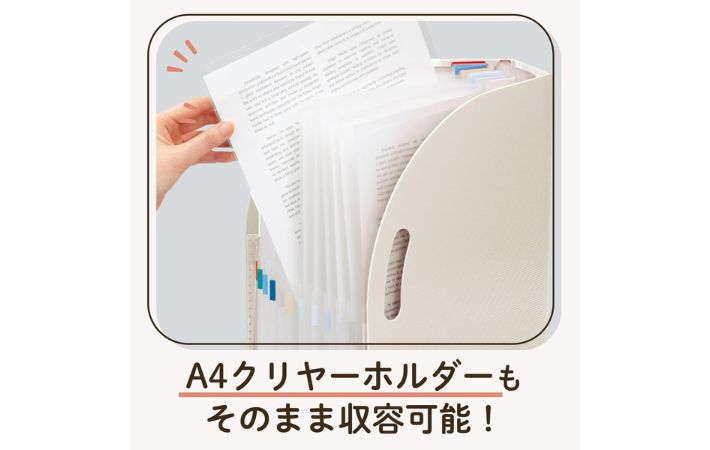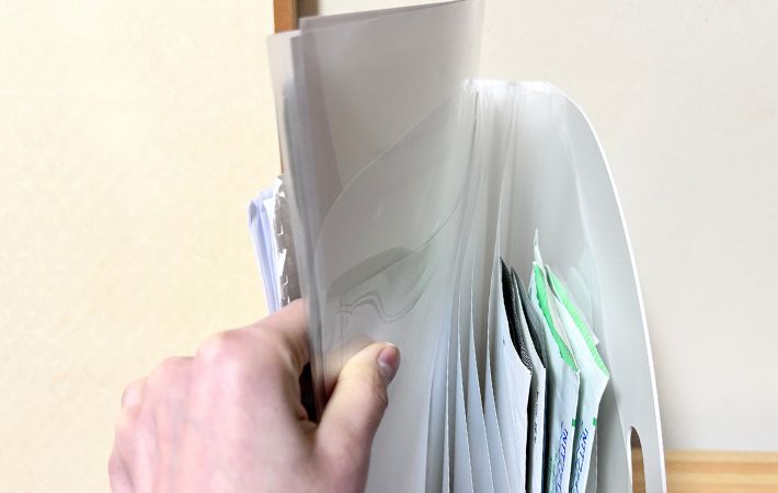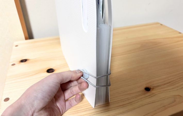 クリヤーフォルダーごと差し込める構造になっているのも便利ですよね。領収書や契約書などをざっくりまとめて仕分けできます。