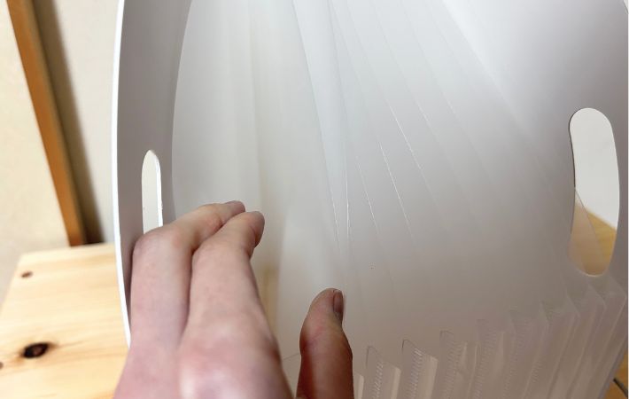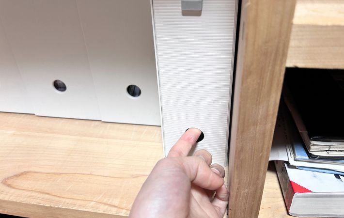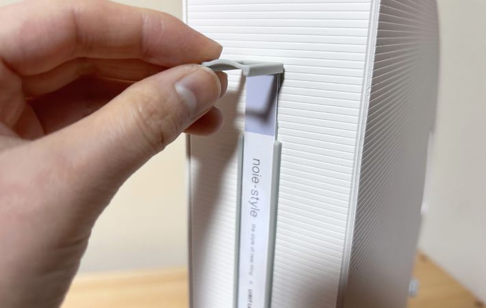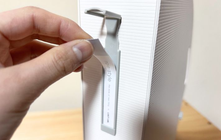 本体の前面には大きめの穴が開いているため、棚にしまった状態からでもサッと指を掛けて引き出しやすいのが便利。