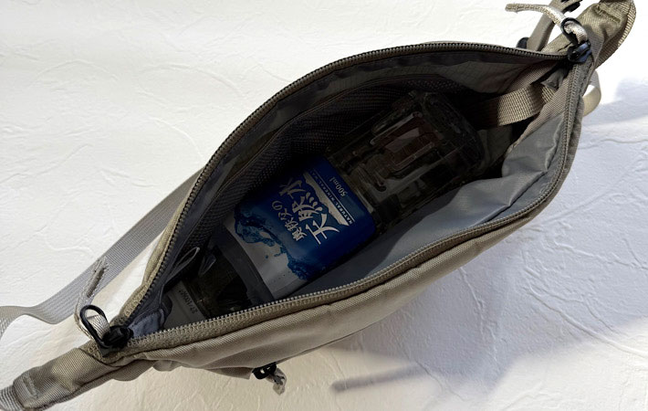 メインポケットは500mLのペットボトルがすっぽり収まる長さがあります。ダブルジッパー仕様なので、開け閉めも楽ちん。