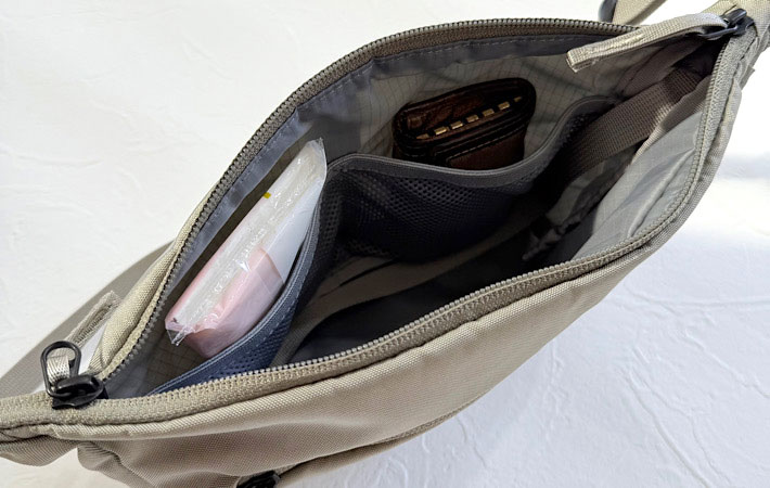 内側には仕切りのあるメッシュポケットがついているので、小物の整理に便利です。