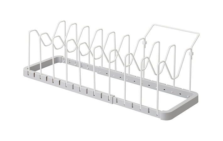 フライパンや鍋、フタ、ザルなど、重ねて収納しにくいキッチングッズをきれいに整頓でき、取り出しも簡単です。