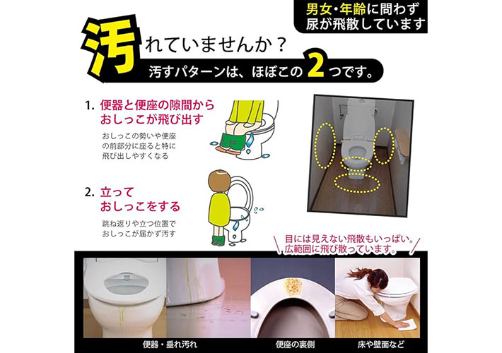 便器のフチや便座の裏におしっこが垂れてきたり、床や壁にも飛び散ったり、あっという間にトイレが汚れてしまいます。