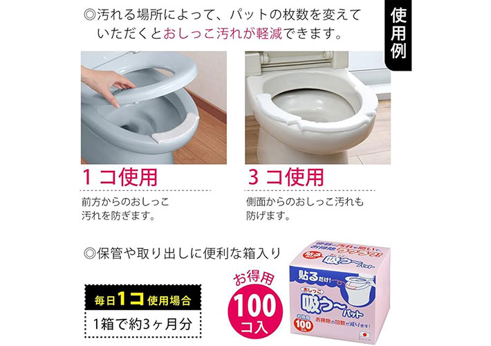 「頼むから座ってして!」 長年の『便座汚れる問題』に終止符が打たれる日が来た!コレを便器の縁に… ホーム・キッチン By - かねやん 更新:2025-12-17 ※本記事はUPDATEが独自に制作したコンテンツです。また、本記事を経由して商品の購入が発生した場合に、ECサイト等から送客手数料を受領することがあります。 家でもお店でも、汚れているとげんなりする場所といえば、トイレ。 せっかく気持ちのいい時間を過ごしても、トイレが汚いだけで帳消しになってしまいませんか。 家のトイレもきれいな状態をキープするため、できる限りこまめに掃除をしている筆者。でも、我が家には行く手を阻む強敵がいるのです…。 ※写真はイメージ それは、立って用を足す夫と、まだトイレに不慣れな子供! 便器のフチや便座の裏におしっこが垂れてきたり、床や壁にも飛び散ったり、あっという間にトイレが汚れてしまいます。 「頼むから座ってして!」と何度もケンカになったことがありますが、男性的にはなかなか抵抗があるようで…。 そんな男性陣のおしっこの飛び散りに悩まされていたある日、画期的なアイテムを発見! サンコーの『おしっこ吸う~パット』です。 Amazonでサンコー『おしっこ吸う~パット お得用100コ入』見る 楽天市場でサンコー『おしっこ吸う~パット お得用100コ入』見る Amazonでサンコー『おしっこ吸う~パット 10コ入』を見る 楽天市場でサンコー『おしっこ吸う~パット 10コ入』を見る 便器の裏にペタッと貼ると、前方からのおしっこを吸い取ってくれるという嬉しいアイテム。 これを導入してから、我が家のトイレ掃除が格段にラクになりました! 一度使うと手放せない!『おしっこ吸う~パット』 パットはポリエステル素材でできていて、サイズは約6×17cm、厚みは0.8cmほど。 弾力のある柔らかい素材なので、どんな便器の隙間にも対応すると思います。 裏紙を外すと粘着加工がされているので、便座のフチにぺたっと貼って固定される仕組み。 ほどよい粘着力なのでつけ外しも楽チンです。一度貼った後に「もう少しこっちにズラしたい」など、場所の移動も簡単にできますよ。 また、こちらのぴょこっと飛び出たつまみのおかげで指で持ちやすく、取り外しやすくなっているのもポイント。 『おしっこ吸う~パット』を使う前は、便座を上げた時のフチの前面からいつもおしっこが垂れていました。 隙間から漏れて、床と便器の間に垂れているなど、とにかくストレス…! 今では『おしっこ吸う~パット』をフチの前面に貼っています。 裏面のリケイ紙を外して、便器のフチにパットをぺたり。 たったこれだけなんですが、気づくとパットが黄色く染まっていて、完璧ではないにせよ劇的に汚れが減りました! 汚れたあとは取り外して、新しいものと交換すればOK。トイレに流すことはできませんので注意してくださいね。 立って用を足す夫や子供のおしっこの跳ね返り汚れや、便器と便座の隙間からのはみ出しなどに悩まされてきた筆者。 便座を上げて掃除をするたびに不快だったのが、パットが吸ってくれるおかげでかなり快適になりました! 床や壁を拭く手間も、だいぶ軽減されたと思います。 ちなみに、2階寝室の隣にあるトイレは、酔っぱらった夫が夜中にフラフラしながら用を足すので、さらに多方面に汚れやすい傾向…。 そのため、2階のトイレには『おしっこ吸う~パット』を3枚貼って、側面からのおしっこ汚れもがっちりガードしています! 汚れやすい場所によって枚数や貼る位置を調整するのがおすすめですよ。 おしっこの飛び散り問題に悩まされている人は筆者だけではないようで…。 【ネットの口コミ】 ・男性のいる家でぜひ使っていただきたいです。便座裏や床の汚れが少なくなってトイレ掃除がラクになりました! ・こういう商品を探していた!高齢者がいて、気づくとトイレの便座と便器の間が汚れ、下手すると床まで濡れていたり、便座裏にシミがついたのを掃除するのがほとほと嫌になったので購入。大容量で汚れたら気軽に交換できるお値段なのが嬉しいです。 ・すごく助かっています。厚みもちょうどよく、掃除がラクになりました。これからも使い続けたい。 ・小さな子どもがいる我が家では、トイレの尿漏れ・飛び散り対策としてこの商品が大活躍しています。取りつけも簡単で、便器の前に貼っておくだけで、掃除の手間がかなり減りました。 『おしっこ吸う~パット』を使ってみて、「大満足!」という人が多いようです。 男性がいる家庭はもちろん、トイレトレーニング中の小さい子供や身体が不自由な高齢者がいる家庭でも大活躍してくれますよ。 開けるとドーンと大容量! 筆者は頻繁に取り替えるので、お得な100個入りを愛用しています。箱に入っているので、すっきり保管でき、取り出しもスムーズでお気に入り。 1日1個ずつ使うと、3か月ほどもちそうです。 「お試しで使ってみたい…」という人は、10個入りもあるので手軽に購入してみてくださいね! Amazonでサ