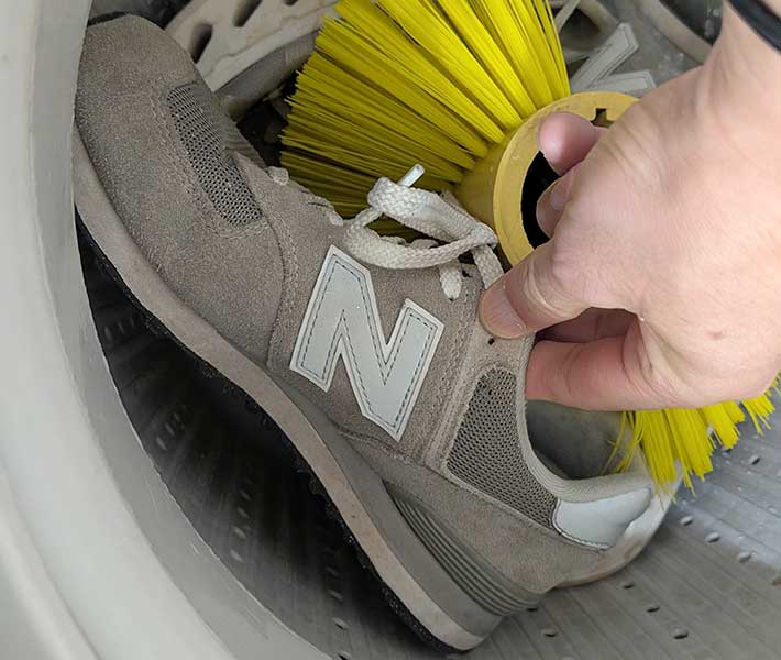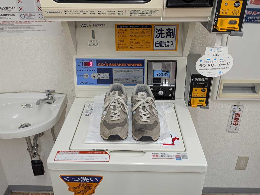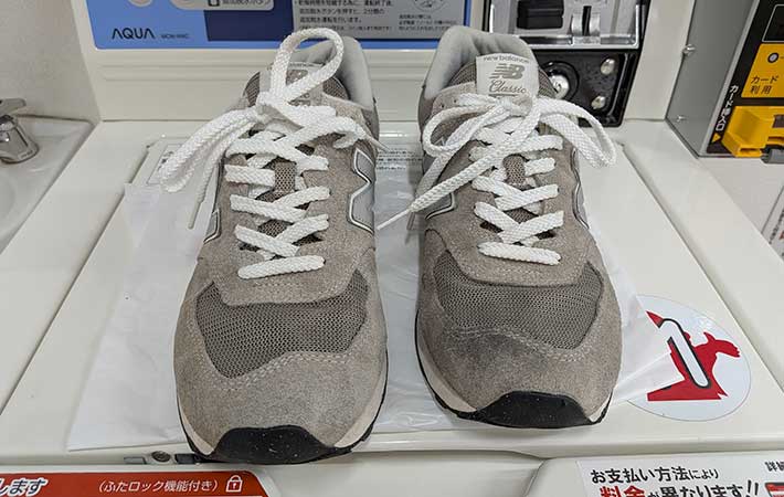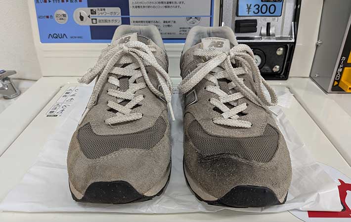 そこで、筆者が2年ほど履いて汚れた574を、コインランドリーの靴専用洗濯機にぶち込んでみました!