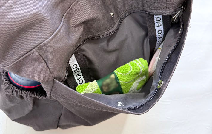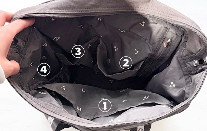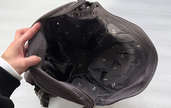 内ポケットは全部で4つ。深めのポケットが3つと、ペットボトルなどを入れられるポケットが1つついていて、整理整頓しやすい仕様になっています。