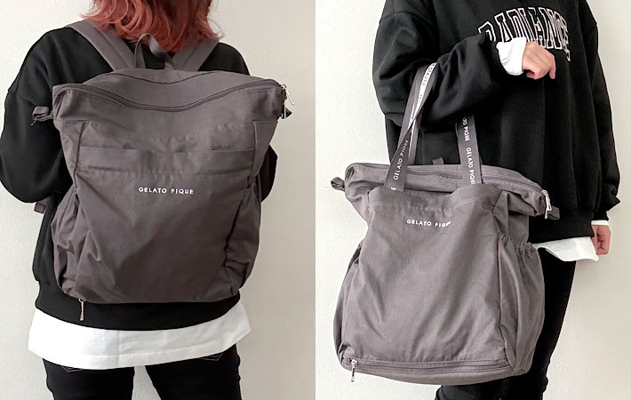 「ババも愛用中!」 ジェラートピケの『2WAYママリュック』がデザインも使いやすさも超優秀でした ファッション By - miu 更新:2025-12-29 ※本記事はUPDATEが独自に制作したコンテンツです。また、本記事を経由して商品の購入が発生した場合に、ECサイト等から送客手数料を受領することがあります。 子育て中のママにとって、マザーズバッグ選びは永遠の悩みです。 機能性を優先すれば、ゴツくてデザインがイマイチなものになってしまいがち。 逆にデザイン重視のバッグは、いざ荷物を詰めてみると収納力が足りなかったり、肩が痛くなったり…。 「大容量で使いやすくて、しかも持つだけで気分が上がるバッグが欲しい!」 そんなママの切実な願いを、あの『ジェラートピケ』が叶えてくれました。 本記事でご紹介する『2WAYマザーズリュック』は、ジェラートピケらしい優しく上品なデザイン。さらに、パパも持てる絶妙カラーが魅力です。 夫婦で一緒に使える、まさに最強のファミリーバッグでした。 「パパも持てる!」ジェラピケの上品デザイン Amazonで見る 楽天市場で見る 主張しすぎないグレーカラーは、どんなママコーデにも合わせやすい落ち着いた色味。 筆者が選んだのはチャコールグレー。 ほかに、ライトグレーもあります。 Amazonでライトグレーを見る 楽天市場でライトグレーを見る 中央にあるブランドロゴも主張しすぎず控えめ。 いかにもマザーズバッグといった雰囲気はなく、まるで普段使いのオシャレなバッグのようです。 男性が持っても違和感のないシックなデザインなので、カジュアルなパパのファッションにもすんなり馴染んでくれますよ。 まさに神設計!抱っこ紐のまま使える機能ポケット 見た目のかわいさだけでなく、このバッグのすごいところは使い勝手のよさなんです! ママの行動パターンがよく分かっていて、「あったら絶対便利!」という機能が、全部詰まっていました。 まず驚いたのが、メインコンパートメントの容量。ガバッと大きく開くので、中身もとても見やすいです。 内側もチェリー柄でかわいい! 内ポケットは全部で4つ。深めのポケットが3つと、ペットボトルなどを入れられるポケットが1つついていて、整理整頓しやすい仕様になっています。 外ポケットも両側についているので、サッと取り出したい子供の水筒やペットボトルの収納にぴったり。 ポケットはこれだけではありません。 なんとリュックの下部にもポケットが! ゴミや汚れた服やゴミなど、ほかの荷物と分けたいものを入れるのに重宝しました。 そして、何より便利だったのが、この背面のファスナー! 背負ったまま、片手でバッグの中身を取り出すことができるので、子供を抱っこした状態でもストレスなく使えます。 奥のほうに入れてしまった荷物にも簡単に手が届きますよ。 リュックからトートへ!驚きの2WAY仕様 このリュックの最大の特徴とも言えるのが、「リュック」と「トートバッグ」の2WAY仕様であること。 シーンに合わせて持ち方を変えられるのはとても便利ですよね。 リュックとして使う時は、トートバッグの持ち手を前面と背面のポケットにそれぞれ収納可能。 ファスナーを閉めて、スナップボタンを留めれば、紐がだらんと垂れることなくスッキリとした見た目に。 紐のデザインがかわいいので、あえて出したままで使うのもアリでしょう。 リュックからトートバッグへの切り替えも簡単! リュックのショルダーベルトを両側外します。 そのまま背面のポケットに収納するだけ。 背面ポケットはリュックと同じ大きさなので、ショルダーベルトもすっぽり!スナップボタンでしっかりと留めることができますよ。 ちなみに、前面と背面のポケットは収納としても使えるので、外側だけでポケットが5つあることになります。 持ち手が長めに作られているので、肩掛けも可能。 収納力抜群で、旅行に持って行っても活躍してくれそうです! 実際に荷物を入れてみた! 実際にどのくらい荷物が入るのか検証してみました。 ・財布 ・ハンカチ ・ティッシュ ・ウェットティッシュ ・キーケース ・ママポーチ ・おむつセット(おむつ、おしり拭き) ・着替え2人分 ・水筒2人分 ・母子手帳ケース ・おやつ これだけの量を入れても、まだまだ余裕がありました! キーケースはなくさないよう奥のポケットに、こまごまとしたポーチやウェットティッシュは内ポケットに。 どこに何があるか分かりやすく整理できます。 水筒は両サイドのドリンクホルダーにすっぽり。 よく使うハンカチとティッシュは、前面の持ち手を収納しているポケットへ。 スナップボタンだけで開閉すれば、必要な時にすぐ取り出せるのでラクですよ。 ちなみに筆者は、あえて財布を一番奥に入れて、背面のファスナーからサッと取り出せるようにしています。 これなら、抱っこ紐をしたままでも、ぐずった子供を片手で抱っこしていても、買い物の時に片手で会計ができてとっても便利! 夫婦で快適な育児を!家族の必需品リ