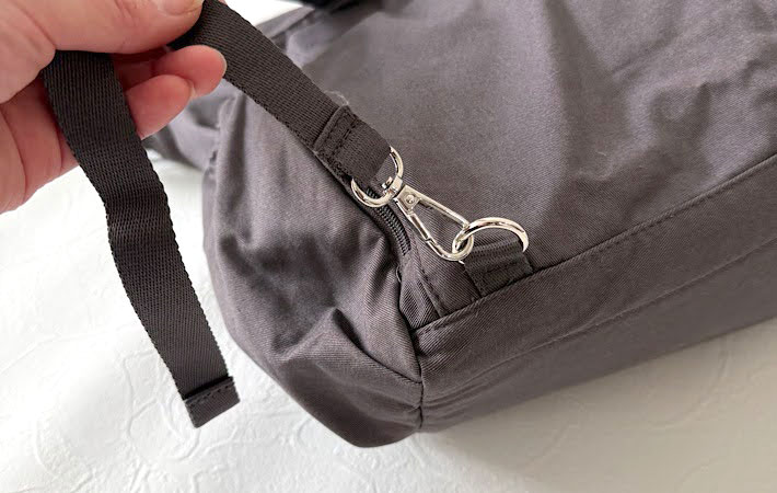 ファスナーを閉めて、スナップボタンを留めれば、紐がだらんと垂れることなくスッキリとした見た目に。
