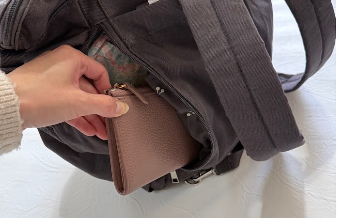 ちなみに筆者は、あえて財布を一番奥に入れて、背面のファスナーからサッと取り出せるようにしています。