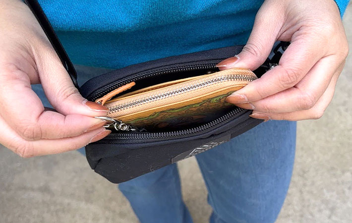 『クロスボディバッグ』に入れておけば、レジ前でも慌てずに対応できます。