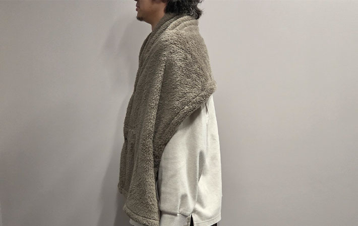 幅広い使い方と、使い勝手のよさが光る『再生ポリエステルあったかボア ケープ』。