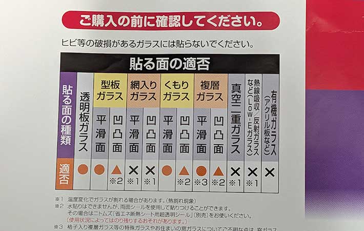 断熱シートは、温度変化でガラスが割れる場合があるので、網入りガラスや真空二重ガラスなどには使えません。