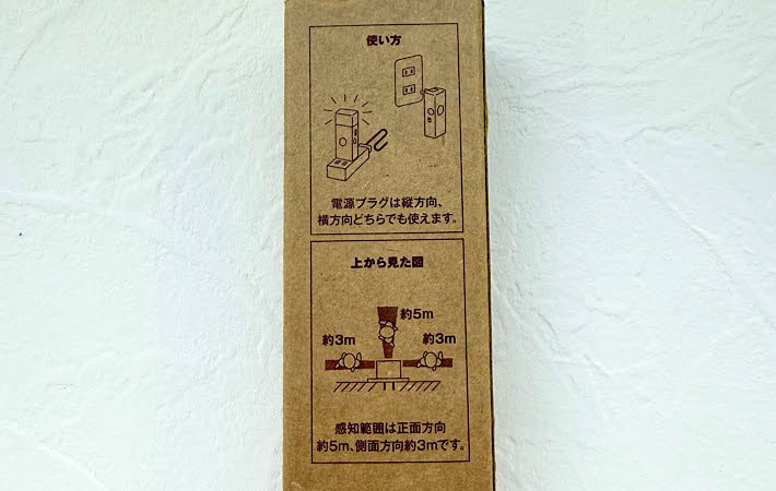 商品の説明書によると、センサーの感知範囲は正面方向で約5m、側面方向で約3mとのこと。