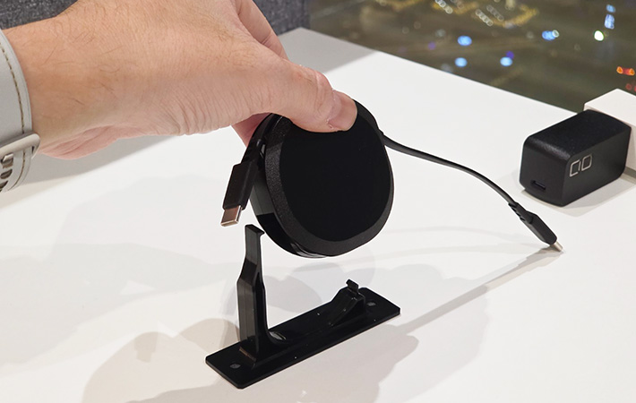 外出時はシンプルな片引きタイプの巻き取り式ケーブルとして持ち歩き、自宅やオフィスではスタンドにセットして据え置き用として使えます。