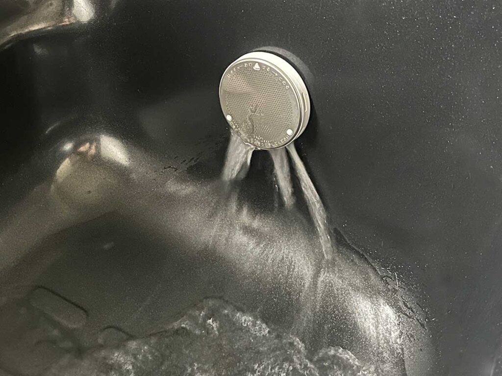 給水穴の上3cmの線までお湯が溜まったら、設定温度を48℃に設定し直して追いだきを開始し、すぐに洗浄カップにA剤を投入します。