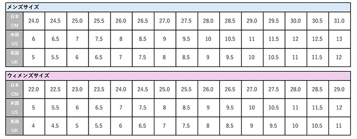 シューズのサイズ換算表メンズ/ウィメンズ