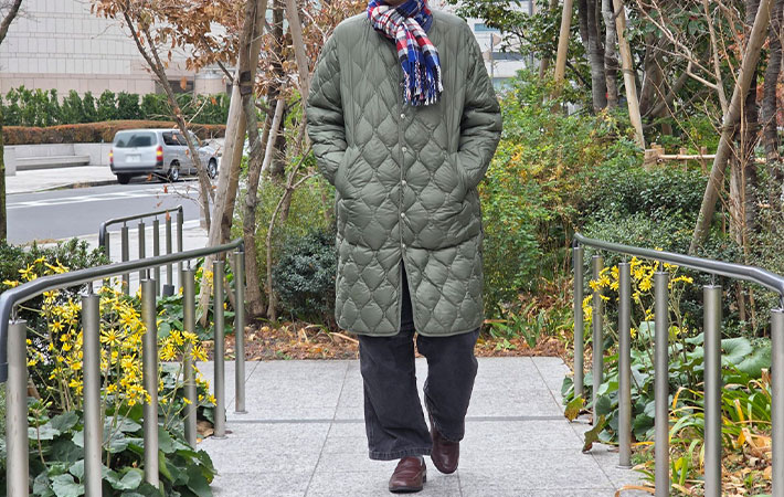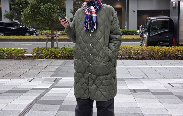 12月中旬の冷え込みが厳しい平日、Tシャツとセーターの上から羽織り、首元にはマフラーを合わせました。
