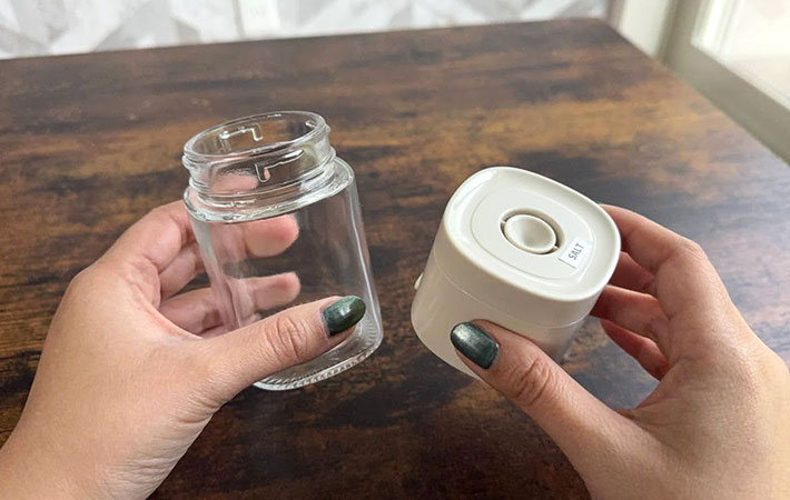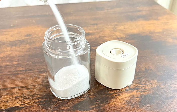広口設計なので塩の詰め替えがしやすく、ガラス製の本体は洗いやすさもばっちり。