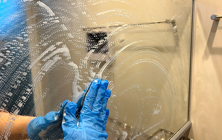 5分放置した後、スポンジや布でこすり洗いをし、洗浄成分が残らないように十分に水で洗い流すか、水拭きをします。