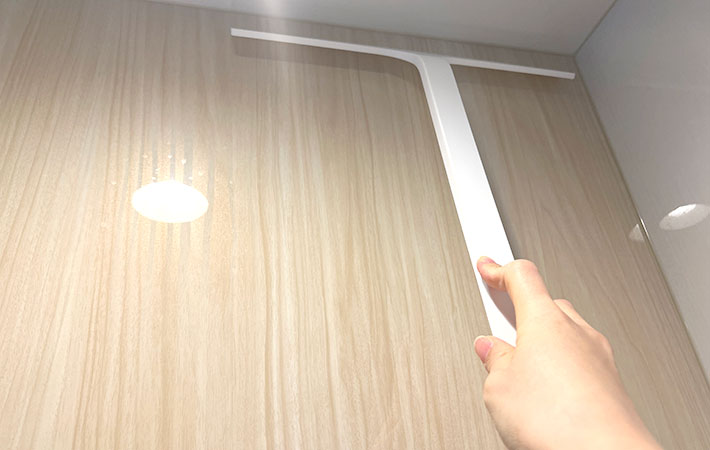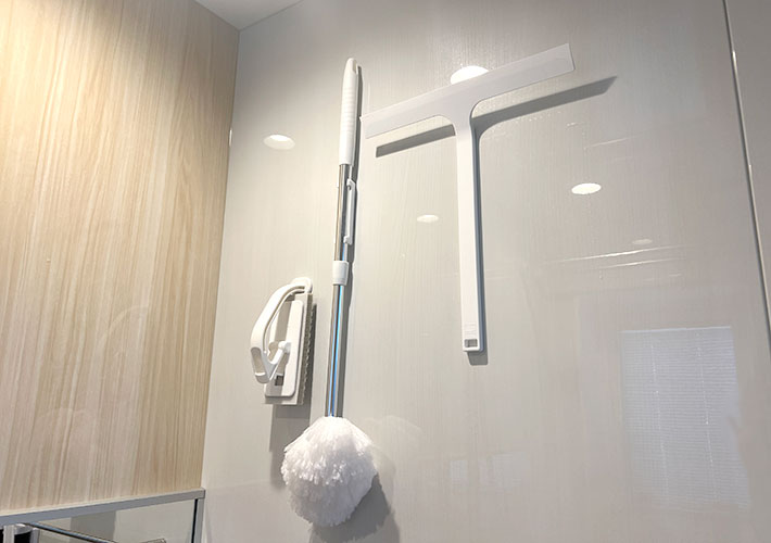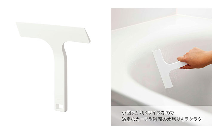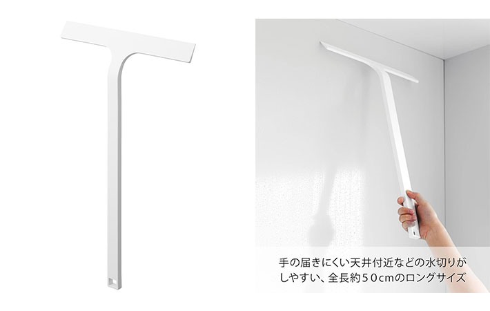 また、柄が長いので、鏡以外にも、天井や壁の高い場所、浴槽の底の水切りもラクチンです。